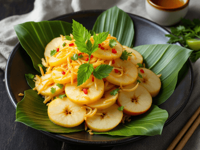 Apple Slices, known locally as 'Epal Hirisan', may seem simple, but this fresh dish has found its way into Malaysian lunch tables, especially as a light, refreshing option in Malaysia’s humid climate. Drawing on the country’s multicultural influences, these Apple Slices are elevated with a zesty sambal-inspired dressing using local ingredients such as limau nipis (lime), cili padi, and a sprinkle of toasted biji bijan (sesame seeds). The result is a nutritious dish that bursts with sweet, tangy, and mildly spicy flavors—a true reflection of Malaysia’s vibrant food scene. Malaysians love incorporating fruits into their meals, from rojak to fruit salads, and Epal Hirisan is an easy, delightful way to enjoy local and imported apples with a tropical twist. This healthy recipe is perfect for those looking for a light, vegetarian lunch or as a palate cleanser during larger meals. With its crisp texture and aromatic notes from daun pudina (mint leaves) and optional bunga kantan (torch ginger flower), it provides a modern take on traditional Malaysian fruit dishes while keeping health at the forefront.