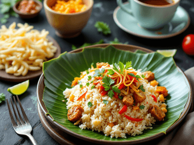 Banana Leaf Rice, known locally as 'Nasi Daun Pisang', is a beloved Malaysian lunch that beautifully showcases the multicultural heritage of Malaysia, especially among the Indian-Malaysian community. This dish features steamed white or brown rice served atop a fresh banana leaf, surrounded by an array of vibrant vegetarian sides like vegetables, lentil curries (dal), tangy pickles, and crispy papadam. The banana leaf imparts a subtle aroma and is believed to have health benefits, making each meal both a sensory and wholesome experience. Originating from South Indian traditions, Banana Leaf Rice has evolved in Malaysia to incorporate local ingredients such as pandan leaves, lemongrass, and curry leaves. The meal is typically enjoyed communal-style, reflecting the Malaysian spirit of togetherness. The variety of sides, often featuring fresh ulam (local herbs) and seasonal vegetables, makes this a colorful and nutritious choice. Whether enjoyed at a bustling mamak restaurant or at home, Banana Leaf Rice is a true celebration of Malaysian vegetarian cuisine, offering a balanced and satisfying lunch that is as nourishing as it is flavorful.