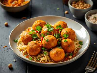 Fried Peanut Balls, known locally as 'Kacang Goreng Bersalut', are a beloved vegetarian snack and lunch option in Malaysia. Deeply rooted in the multicultural tapestry of Malaysian cuisine, these crispy peanut balls are often enjoyed at local warungs (stalls) and festive occasions. Drawing from Malay, Chinese, and Indian culinary influences, this delicacy combines roasted peanuts with fragrant pandan, giving each bite a delightful crunch and aroma. The balls are made with a simple batter of rice flour and wheat flour, lightly seasoned and fried to golden perfection. The taste is a harmonious blend of nutty richness and subtle sweetness, complemented by the earthy fragrance of pandan leaves. This healthy adaptation uses minimal oil and incorporates whole, natural ingredients, making it ideal for calorie-conscious eaters. Fried Peanut Balls are not only a delicious and satisfying lunch option, but also a testament to Malaysia's vibrant street food culture and its inventive use of local ingredients. Perfect for sharing, this dish brings people together, celebrating Malaysia’s rich heritage in every bite.