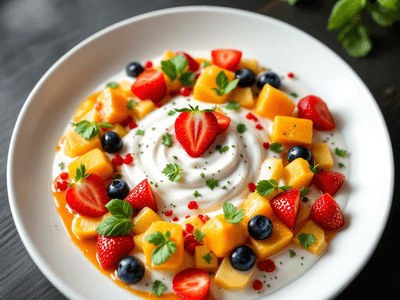 Fruit Yoghurt, or Yogurt Buah, is a refreshing and nutritious dish popular across Malaysia's multicultural communities. This healthy lunch option showcases local tropical fruits like mangga (mango), betik (papaya), and pisang (banana) combined with creamy yogurt for a naturally sweet and tangy treat. Its simplicity makes it a staple in Malaysian homes, especially in urban areas where quick, nutrient-rich meals are cherished. In Malaysia, Fruit Yoghurt is often enjoyed as a cooling lunch during the hot afternoon or as a wholesome snack for children and adults alike. By selecting local seasonal fruits and unsweetened yogurt, this dish highlights the nation’s diverse agricultural bounty and its tradition of balancing flavors and textures. The use of pandan for a subtle fragrance and a sprinkle of biji selasih (basil seeds) adds a distinctly Malaysian twist, making this Fruit Yoghurt not only delicious but also culturally significant. It’s a great choice for those seeking a vegetarian and health-conscious meal inspired by Malaysian cuisine.