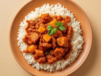 This vegetarian Kari Ayam is rich in plant-based protein from tofu and delivers dietary fiber from potatoes, carrots, and eggplant. Santan (coconut milk) supplies medium-chain triglycerides that are easier to metabolize. The aromatic spices provide antioxidants, vitamins C and A, and minerals such as potassium and magnesium. With minimal oil and no meat, this dish is lower in saturated fat, making it suitable for calorie-conscious diets. The inclusion of vegetables ensures a balanced intake of carbohydrates and micronutrients.