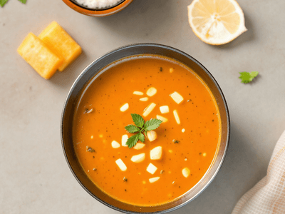 Mysore Rasam is rich in dietary fiber and plant-based protein thanks to toor dal, making it beneficial for digestion and muscle health. Tomatoes add Vitamin C, while spices like black pepper and lemongrass boost metabolism and immunity. The dish is low in fat, contains no cholesterol, and is naturally gluten-free. Curry leaves and coriander supply antioxidants and essential minerals, supporting overall wellness.
