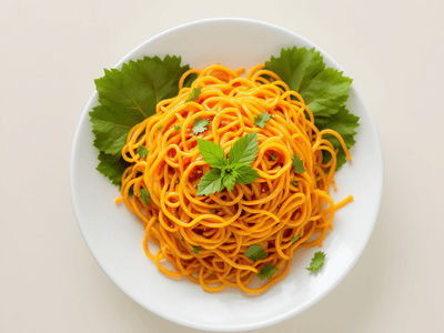 Pumpkin is rich in beta-carotene, vitamin C, and potassium, making it excellent for immune support and heart health. Glass noodles are naturally gluten-free and low in fat, providing a light source of carbohydrates. The use of santan in moderation adds healthy fats, while fresh vegetables like carrot and spring onion contribute fiber, vitamins, and antioxidants. This dish is cholesterol-free, low in saturated fat, and supports a balanced vegetarian diet.