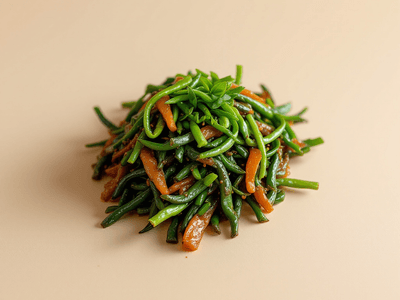 Sambal Kangkung is a classic Malaysian stir-fry dish featuring crisp water spinach (kangkung) tossed in a spicy, aromatic sambal sauce. Widely enjoyed across Malaysia, this vegetarian recipe is beloved for its vibrant flavors and wholesome ingredients. Kangkung, also known as 'morning glory,' is commonly found in local markets and is a staple in Malaysian home cooking and hawker stalls. The dish embodies Malaysia's multicultural cuisine, blending Malay, Chinese, and Indian culinary influences through the use of sambal, a chili-based condiment, and locally sourced produce like lemongrass and shallots. Traditionally, Sambal Kangkung is served during lunch as a side or main dish with steamed rice. Its bold flavors and fresh vegetables make it a favorite for both everyday meals and festive gatherings. Using authentic Malaysian ingredients such as belacan (fermented shrimp paste), pandan leaves, and chilies, this health-conscious version celebrates the natural goodness of kangkung while maintaining the iconic spicy, tangy, and savory flavors that Malaysians love. The dish is perfect for those seeking a nutritious vegetarian option that fits seamlessly into a balanced diet.