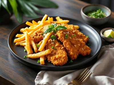 Chicken Tenders with Fries, locally enjoyed as a modern snack, blends Malaysia’s multicultural culinary essence with wholesome ingredients. While the dish is inspired by Western snack culture, Malaysians have embraced it by adding local twists—herbs like pandan and lemongrass infuse the chicken with aromatic notes, while the fries are made healthier by baking and seasoning them with spices such as kunyit (turmeric) and a hint of serai (lemongrass). The result is a snack that’s both familiar and uniquely Malaysian, offering satisfying crunch and flavor without excessive calories. This dish is perfect for gatherings or as a light meal, reflecting Malaysia’s vibrant food scene where global influences meet local traditions. The use of fresh chicken breast, quality potatoes, and aromatic Malay spices makes it a great option for those seeking healthy snacking without sacrificing taste. With each bite, you experience a harmony of crispiness, subtle spice, and the heartiness typical of Malaysian home-cooked fare. Whether enjoyed during a family teatime or as a tasty lunchbox addition, Chicken Tenders with Fries is an easy, crowd-pleasing recipe for all ages.